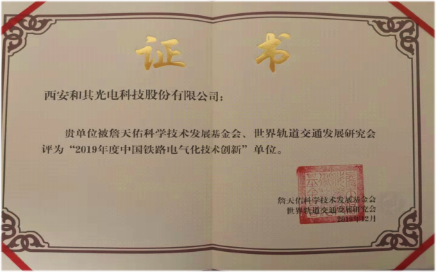 在大會上,和其光電副總經(jīng)理康利軍做了《大數(shù)據(jù)時代下熒光光纖測溫在鐵路智能供電系統(tǒng)中的應用》的技術報告,獲得業(yè)界廣泛關注。與此同時,和其光電被詹天佑科學技術發(fā)展基金會、世界軌道交通發(fā)展研究會評為“2019年度中國鐵路電氣化技術創(chuàng)新”單位,以此表彰和其光電熒光光纖測溫技術在鐵路智能供電系統(tǒng)中的應用及產(chǎn)業(yè)化做出的貢獻。
